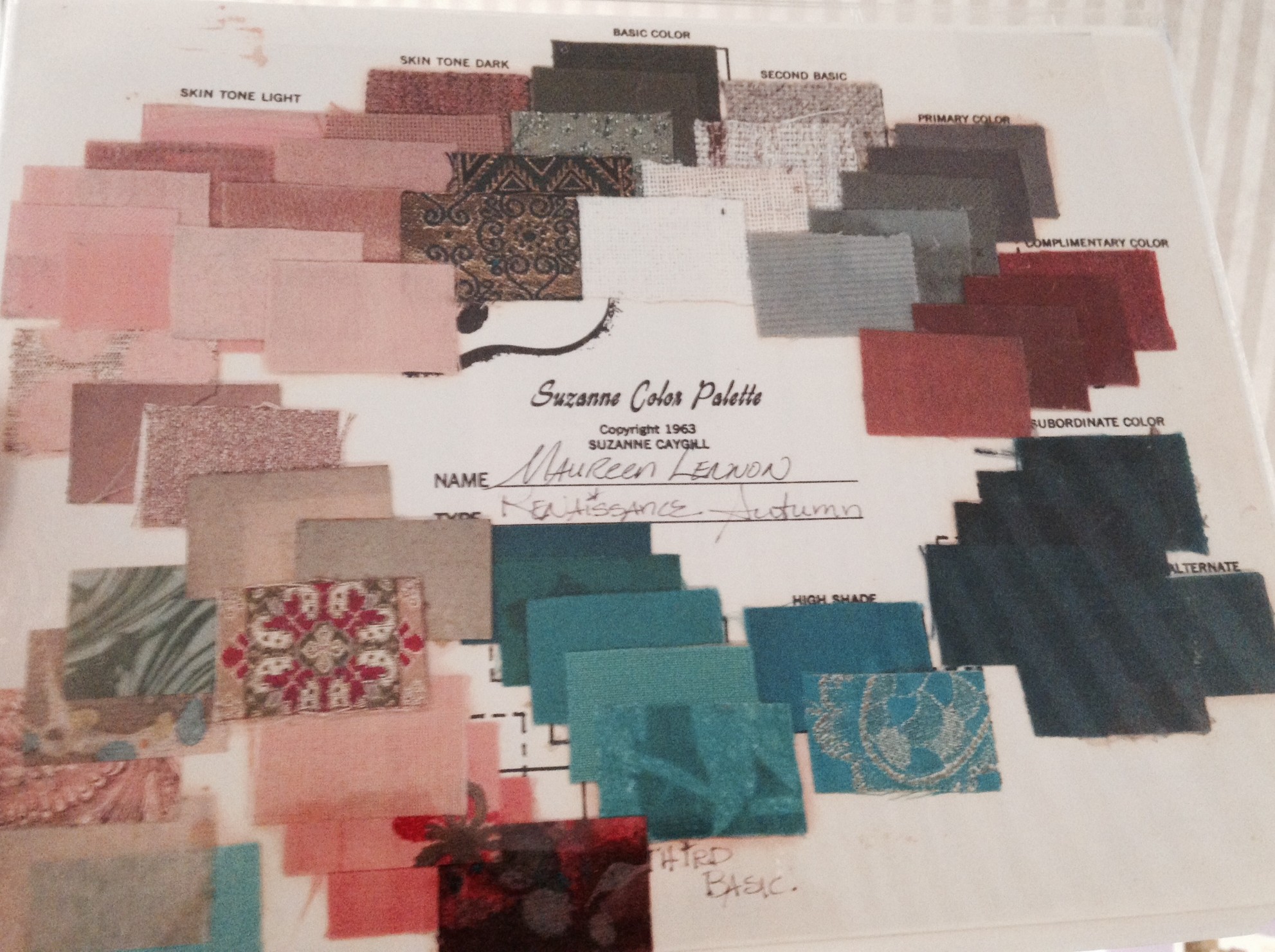 It is for a “Renaissance Autumn,” a sub-type not included in Suzanne’s book, Color, The Essence of You. (Please note the diagonal lines seen in the darker blues on the right are reflections of the wallpaper – those are not prints.)