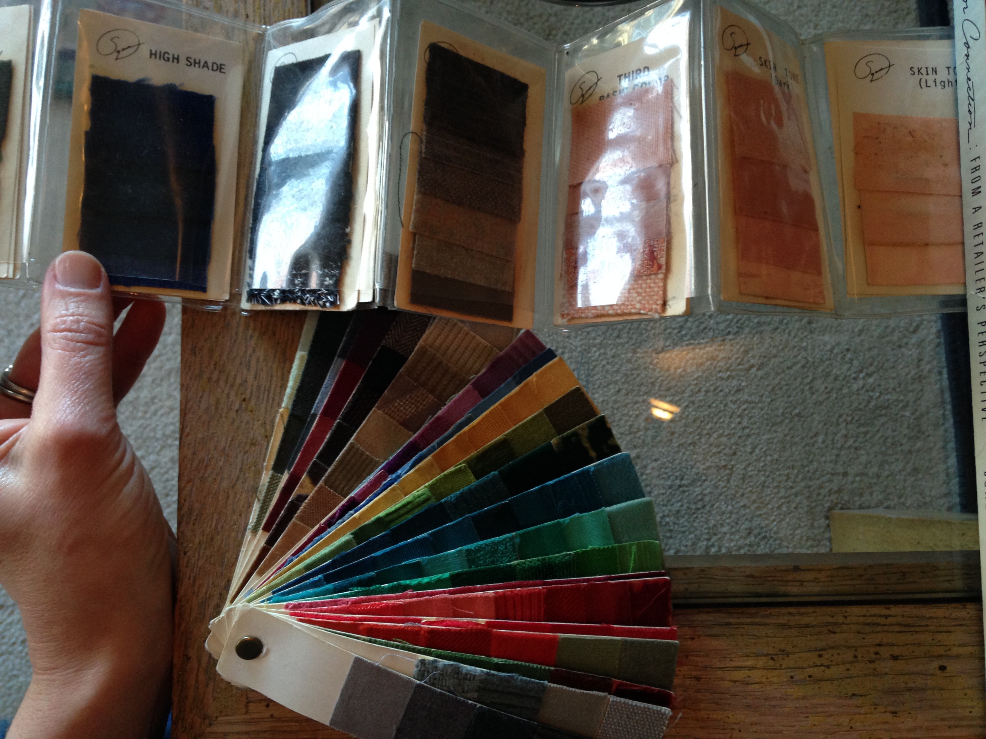 Joan mentions to me (and also wrote in her book) that she sees too many people online in style forums and, before, in her store, thinking they can only wear exact matches to the colors in their palette. She would show people in her store how to open out their palette to see if the color or print in question blended with it. She notes that fabric swatches are far easier to use than paint samples for this purpose. Consider: I have approximately 3,000 fabric swatches to choose from for my clients. The human eye, it is estimated, can discern 10 million colors. An analyst can’t physically store and sort through that many swatches in a timely fashion even if we can discern the differences: it’s simply not practical. (Though I admit I’d have fun having 10,000 swatches to work with or being able to magically alter my fabric samples ever so slightly!) Clients therefore need to understand their palette and remember it’s the overall effect of an outfit that matters. I’m so glad my teacher, Debra Lindquist, taught me this too and I’ve been passing “How to Use Your Palette” notes onto my clients when I send them their colors!