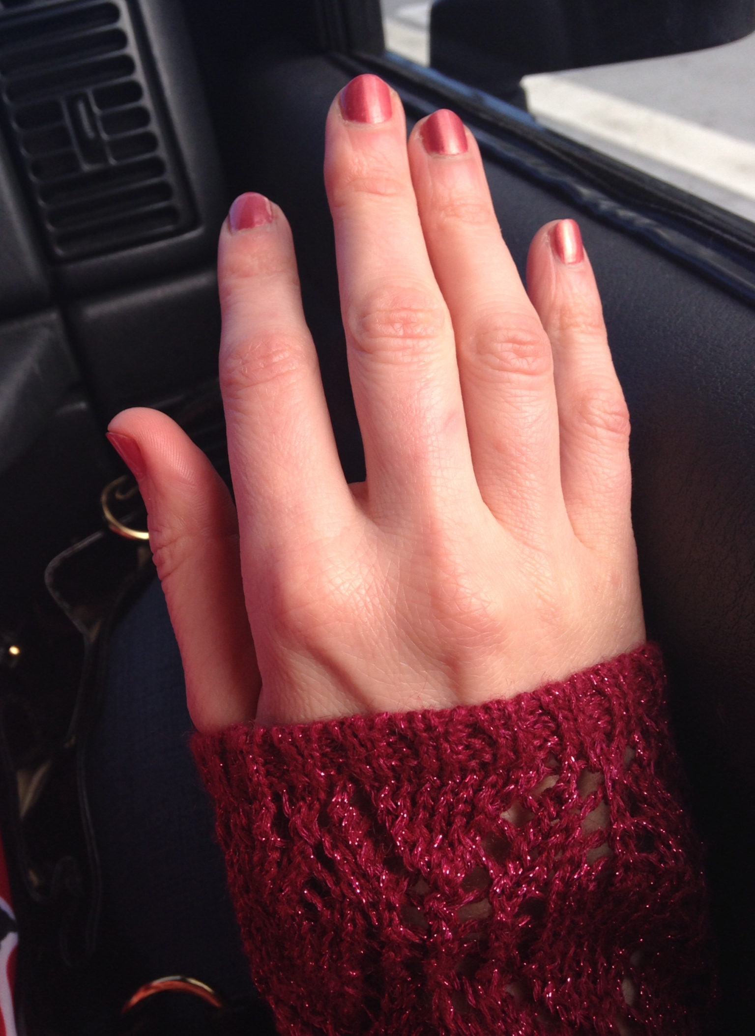 One was a very light, neutral pink.  It was, I thought, a nice shade for a nude nail on me, until I actually applied the three coats needed to get this runny formula looking smooth and then, fully opaque, it was far too light for my eyes to stand.  The other was a dark purple that I bought assuming it’d be fine (dark purple is an area I have lots of wiggle room in) but applied it was actually dark magenta which- agh- was too pink!  Morals of this paragraph: test nail polish not just for color but also for viscosity and don’t leap to ANY assumptions about color in a bottle.