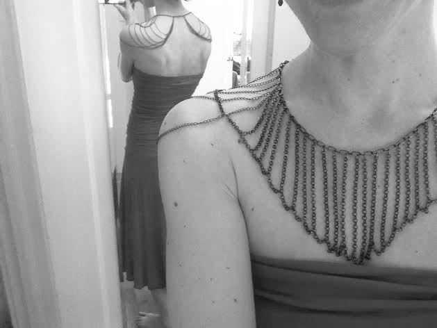 The chain link shrug image might look familiar.  Prompted by Andrea Siegel, in her mind bending book, Open and Clothed  (the review of which you can read here),  to consider clothing that I’d like the SOUND of  -literally the sound of- this was the winner. I could imagine the swishing sounds of the chains, but when I realized that a favorite necklace of mine could be on the front, I fell in love with the entire concept.