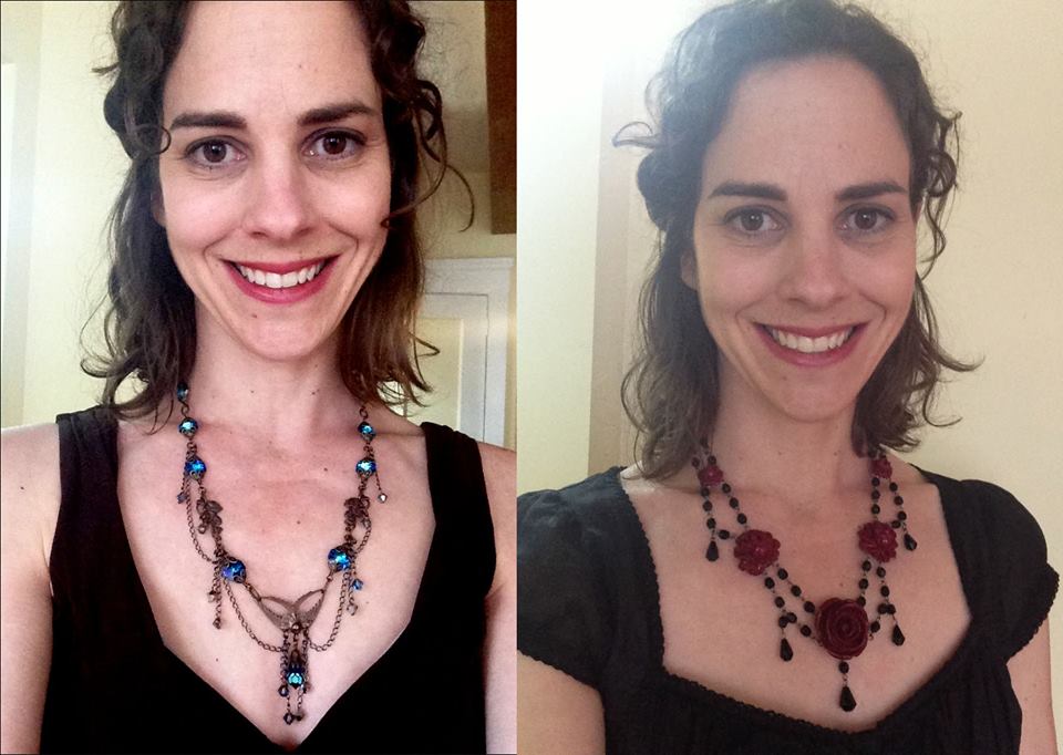 Statement bib necklaces, I love, but 99% of the time they are too chunky and not long enough on me. Multiple layered chain necklaces I also ogle, but on me they are long and narrow, taking my face completely out of focus.   If you know what works on you and want to expand your repertoire, consider necklace styles that you admire from afar and brainstorm ways to adapt them to suit you!  GYB encompasses what appeals about each of these two styles.  I retain the delicacy and face framing aspects that I need AND enjoy the statement and long chain effect!  Win-win!  Play with your necklaces and anything jewelry-like (ribbons, zippers, etc) in the mirror. Take photos and keep tweaking and experimenting, with your most flattering necklines on please, until you like where you’re going with length, size, shape and scale.  Use this information to buy jewelry wisely.