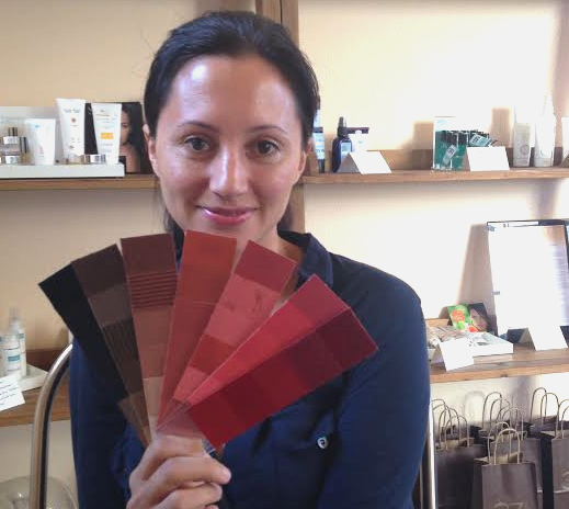 Dara Kennedy, founder of Ayla, with her Beauty Valued extended Flirt Palette. Knowing your best colors is one more strategy to looking fabulous! On the top are her hair colors (her best dark neutrals) and two swatches of her best metals (especially fun for evening clutches and sandals), then her eye color strips (imagine them in a glassy necklace!). Next is her skin tone strip (the lighter end for undergarments under sheer blouses, and the darker colors for nude shoes). The guavas, brandied melon, cinnamons and saffron thread reds – a softly spiced concoction of beauty- lend themselves to a variety of makeup option from natural and elegant to fun and flirty to Christmas party extravagance.  All the swatches I give clients can be used for clothing, accessories and makeup. To learn more about how the skintone strip can be used in makeup selection, see this post here.